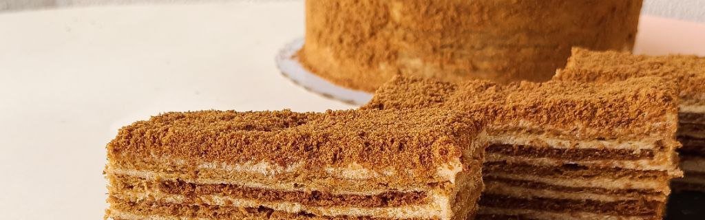 Immerse yourself in the divine layers of our Russian Honey Cake, where each stratum of tender honey-soaked cake and velvety cream tells a story of sweetness perfected. The golden hue and delicate aroma of honey are woven into every slice, creating a dessert that's as visually stunning as it is delectably aromatic.